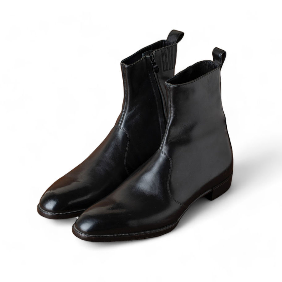Discover Tommy, the epitome of elegance. These handmade Zip Black Boots feature premium Genuine Calf Leather and a Full Leather Sole for durability and comfort. Enjoy Free Shipping from Homa Footwear. Elevate your wardrobe with timeless craftsmanship.